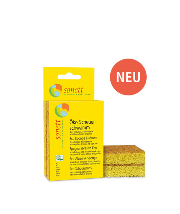 Ein Scheuerschwamm, der den höchstmöglichen Anteil an regenerativen, biologisch abbaubaren Rohstoffen aus Cellulose und Nussschalen enthält, verbunden mit hoher Haltbarkeit und angenehmer Haptik.