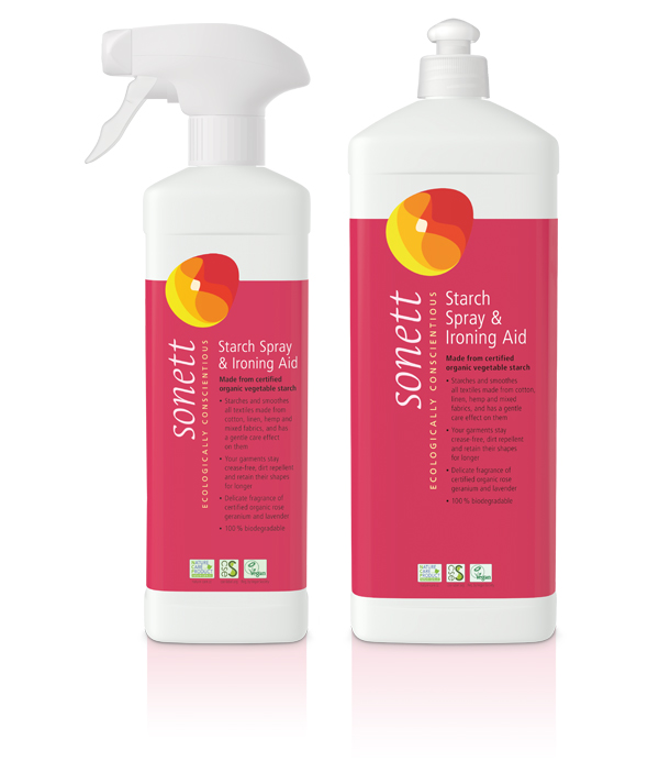 Unlike conventional ironing starches, Sonett Starch Spray does not contain petrochemical silicone as friction-impeding ironing aid. With Sonett Starch Spray and its purely vegetable ingredients (mostly from organic cultivation), you obtain garments which are excellently starched and cared for.