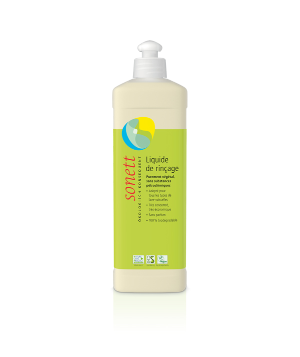 Le Liquide de rinçage Sonett permet un lavage efficace à partir de produits d’origine exclusivement végétale, sans utilisation de substances pétrochimiques.