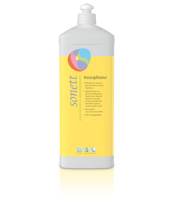 L’Assouplisseur Sonett élimine les résidus de savon et neutralise l’eau de rinçage (important pour les personnes sensibles). Il ravive les couleurs, lisse les fibres et adoucit le linge.
